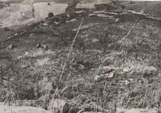 Foto 2 Prospecção da Ul em Julho de 1973.Vê-se em segundo plano os restos de muralha no rebordo do plateaux para ter uma ideia da altura, reparem na árvore em último plano no meio de um arimbo, trata-se de um mutiate com cerca de 15 metros de altura.Foto de V.O.Jorge.
